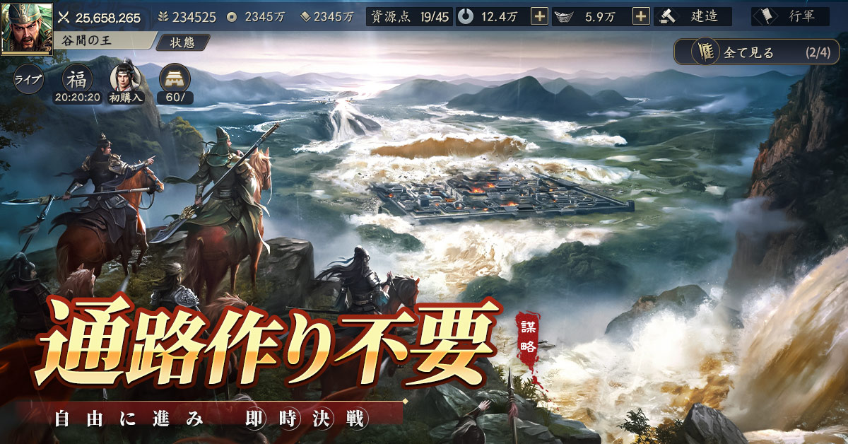 乱世の戦火を、ここに再現!千人規模の軍勢が激突する壮大な戦場で、状況を見極め、最適な戦術を繰り出し、盟友と共に勝利を掴み、本格の策略戦場を満喫しよう